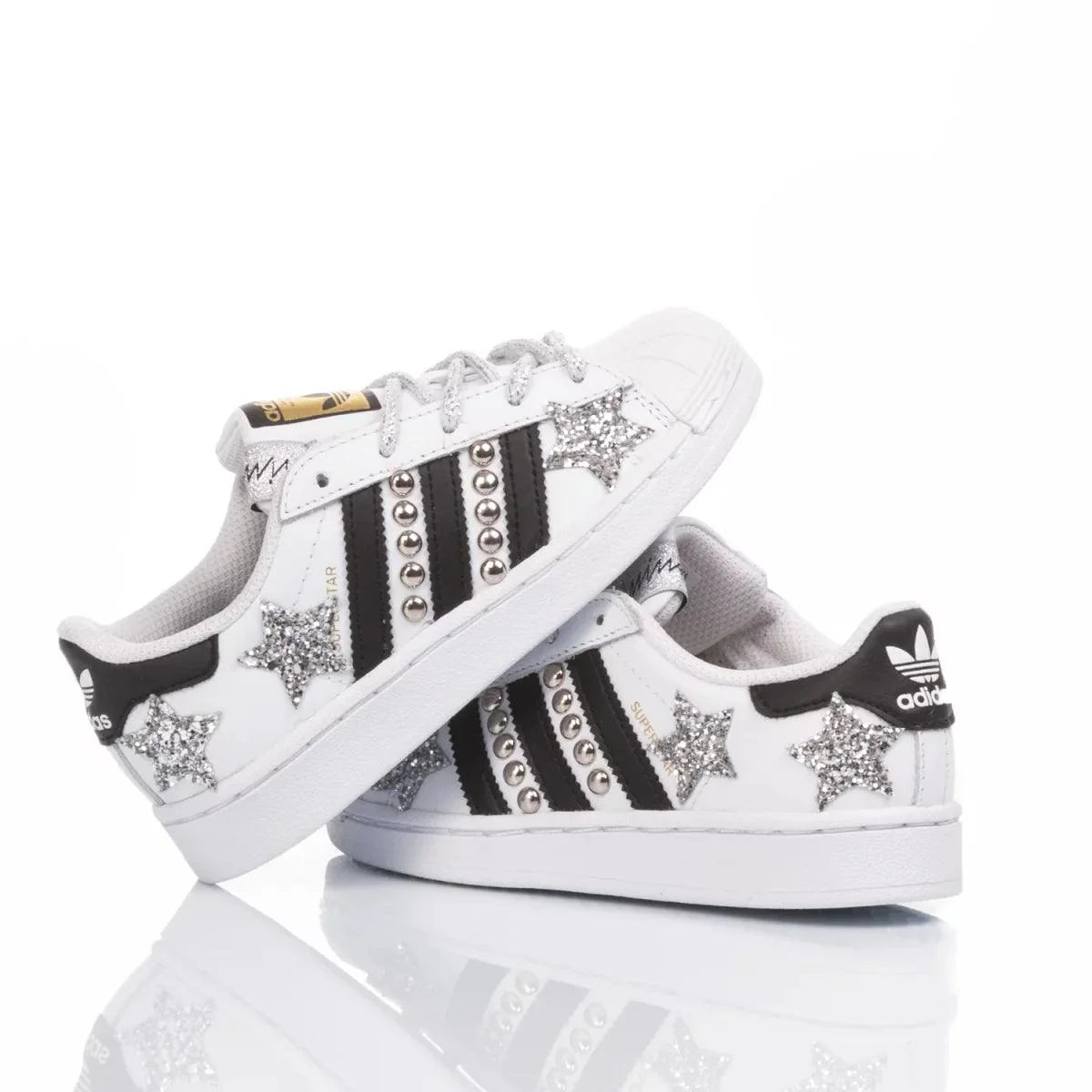 Adidas Superstar Junior Fix, glitter argento e stelle, ecco come nasce questa Adidas, ogni stella viene tagliata e cucita a mano sulla scarpa, per poi applicare tra le righe due file di borchie argento e piatte. Questa sneakers da bambina sprigionerà una luce pazzesca sui tuoi piedi e catturerà gli occhi di tutti. Per permetterti un perfetto stile matchy-matchy mamma e figlia ecco qua la versione adulta. Adidas Superstar Junior Fix ti verrà fornita con lacci laminati argento oltre ai suoi originali bianchi.
