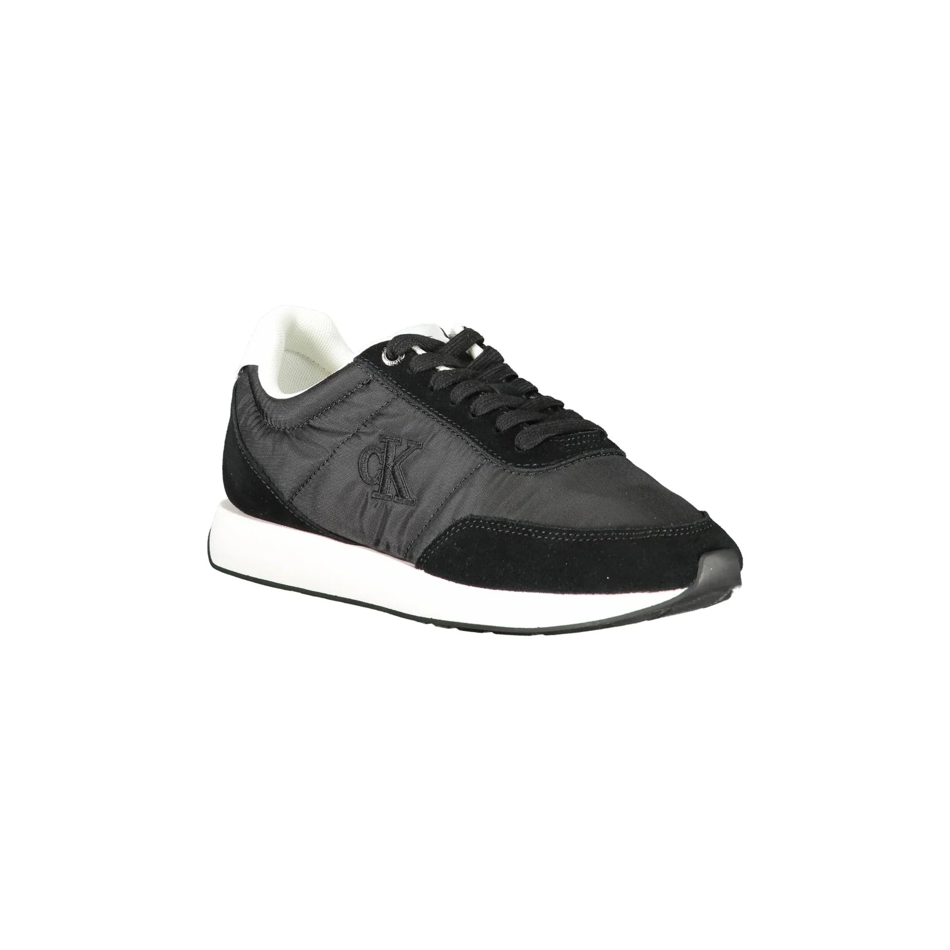 Sneakers Calvin Klein nere con dettagli a contrasto in bianco e ricamo decorativo. Plantare removibile, logo iconico e stile moderno per un look casual chic.