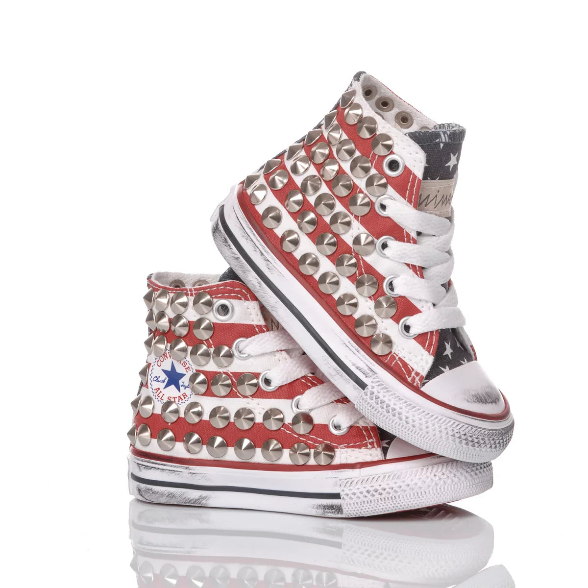 Converse All Star Baby Borchie America, un grande classico in casa Mimanera, per chi ci segue da tempo non servono descrizioni, ma rinfreschiamoci comunque la memoria: si tratta appunto della nostra classica sneakers nella versione alta riproposta anche sulla sneakers da bimbo per un perfetto stile matchy-matchy con il tuo piccolo, sulla quale vengono applicate e fissate manualmente e meticolosamente le borchie, sporcata per darle il giusto tono vintage, il risultato è una scarpa dall'animo un po' rock, per dare la giusta sicurezza e grinta ad ogni tuo passo. La Converse All Star Baby Borchie America ti verrà fornita con i suoi lacci originali bianchi.