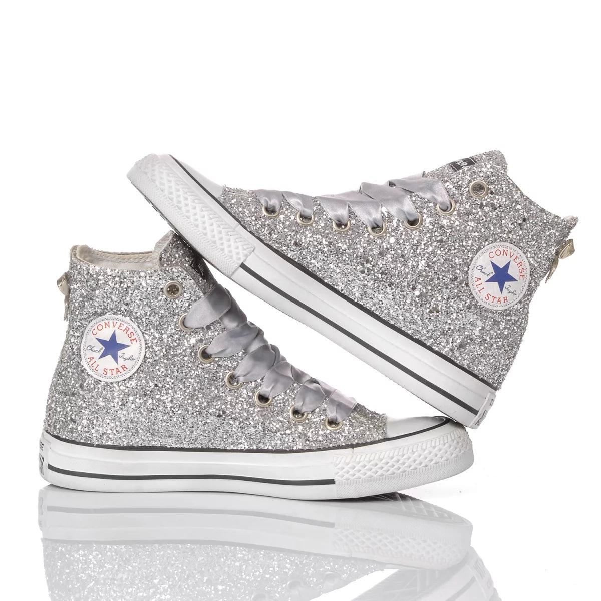 Converse All Star Full Silver, la vera regina della festa: luccica, brilla ed è colorata la nostra full glitter è esattamente ciò che ti serve, interamente ricoperta di glitter argento, lati, linguetta e retro: TUTTA. Con queste sneakers da donna tutti invidieranno i tuoi piedi. La Converse All Star Full Silver ti verrà fornita con lacci in raso grigio oltre ai suoi originali bianchi. Per un maggiore comfort ti proponiamo la nostra solette alzatacco che, oltre alla comodità, ti dona qualche centimetro in più ed uno slancio della figura immediato.