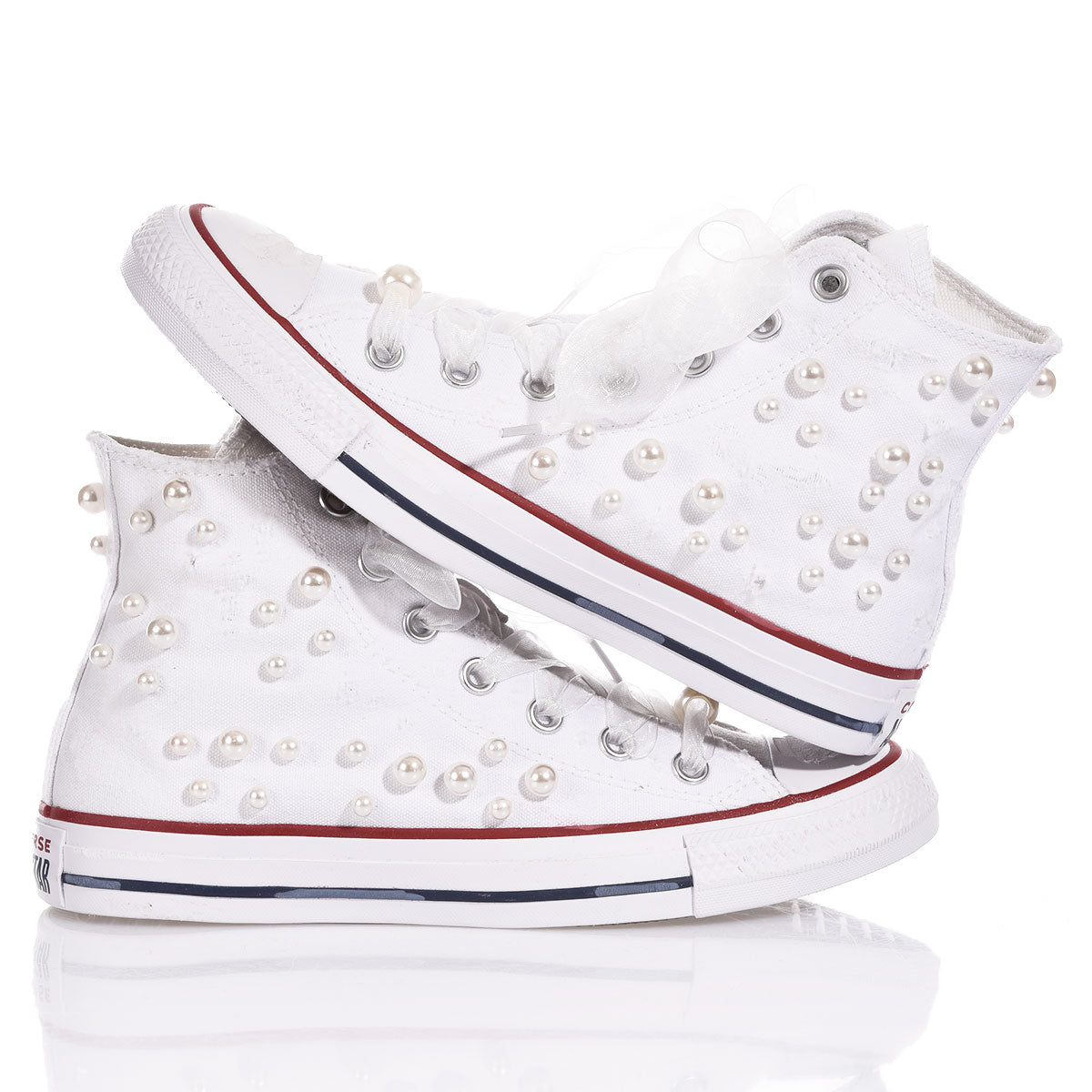 Converse Pearls White è la sneaker ideale per elevare ogni look con un mix di grinta e romanticismo. La cascata di perle e swarovski insieme alle graffiature creano un contrasto audace, mentre i lacci in organza si annodano in un fiocco delicato e femminile.