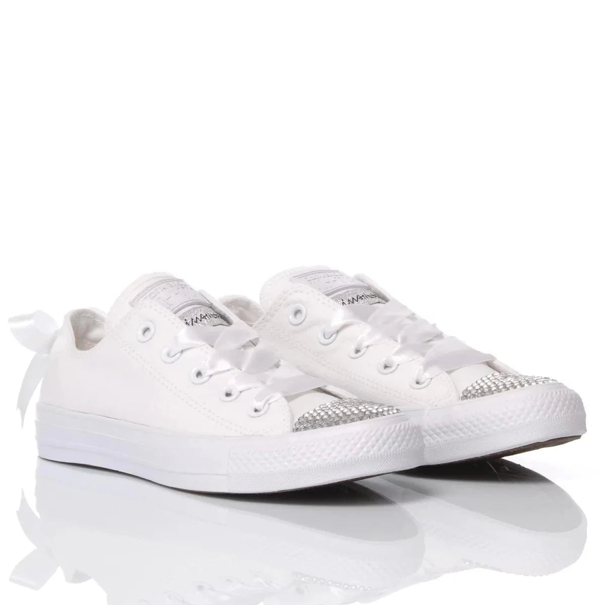 ConverseAll StarSwarovski Lady White Ox, una sneakers da donna nel modello basso tempestata di Swarovski sulla punta ed ancor più personalizzata da un nastro in raso bianco sul retro, accuratamente fissato da una borchia a forma di stella, il tutto tono su tono per evitare di alterare il candore di questa scarpa total white e rendendola perfetta anche per il tuo giorno speciale. La Converse All Star Swarovski Lady White Ox ti verrà fornita con lacci in raso bianco oltre che ai suoi classici bianchi.