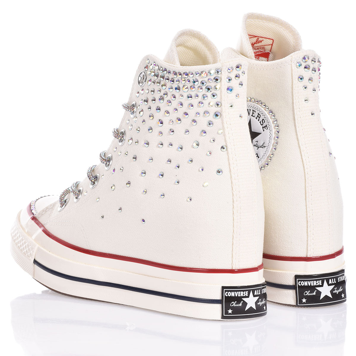 Converse Wedge Swarovski White è la sneaker custom da donna perfetta per ogni look! Pioggia di Swarovski su tomaia e punta perfettamente abbinati ai lacci anche essi in Swarovski. Luce e confort in un unico modello, grazie alla zeppa interna che slancia la figura senza rinunciare alla comodità.