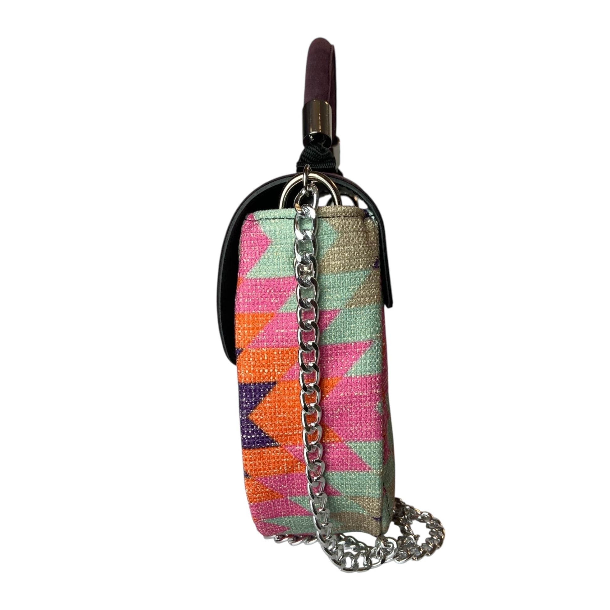 ✨ Corpo in tessuto geometrico multicolor con pattina in alcantara bordeaux