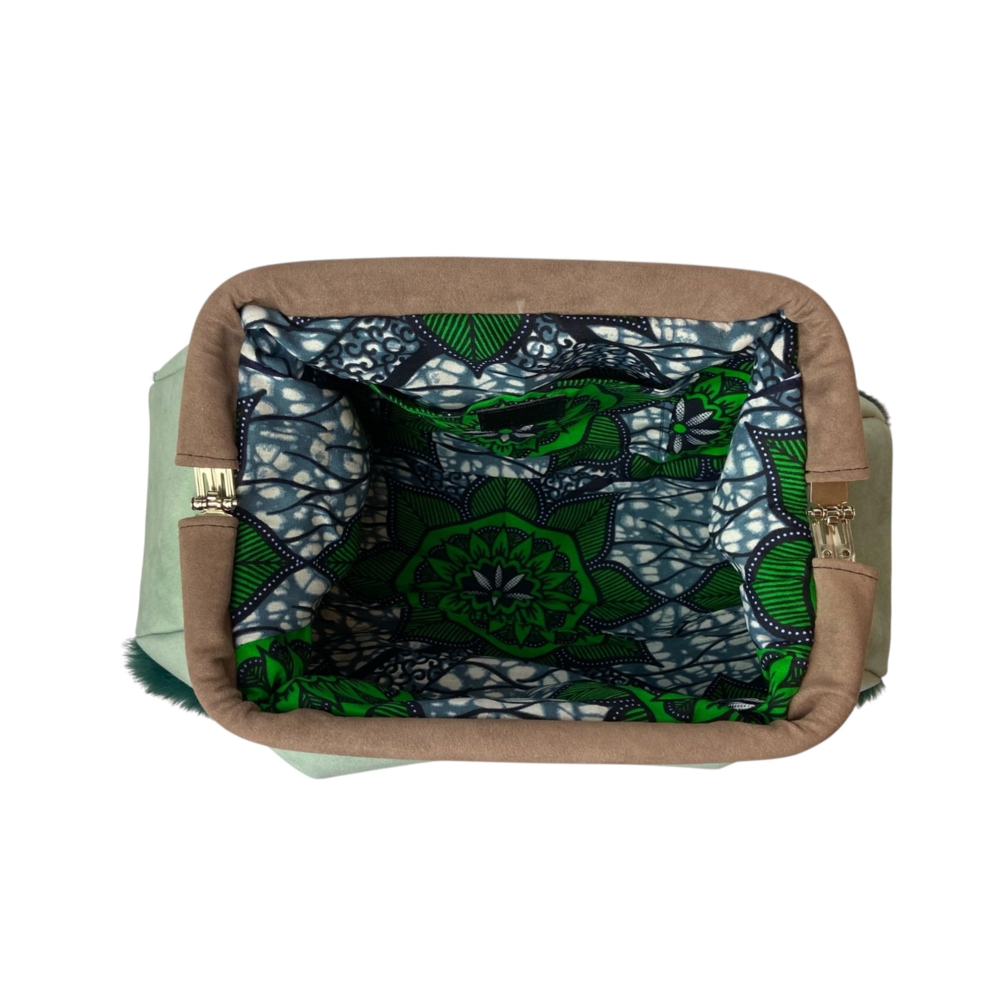 🎨 Dettagli curati: bordatura in pelliccia ecologica verde petrolio per un contrasto unico; accessori metallici finitura platino; interno in cotone wax 100% con tasca – ogni borsa è diversa e irripetibile; etichetta circolare in resina cucita a mano sul fondo
