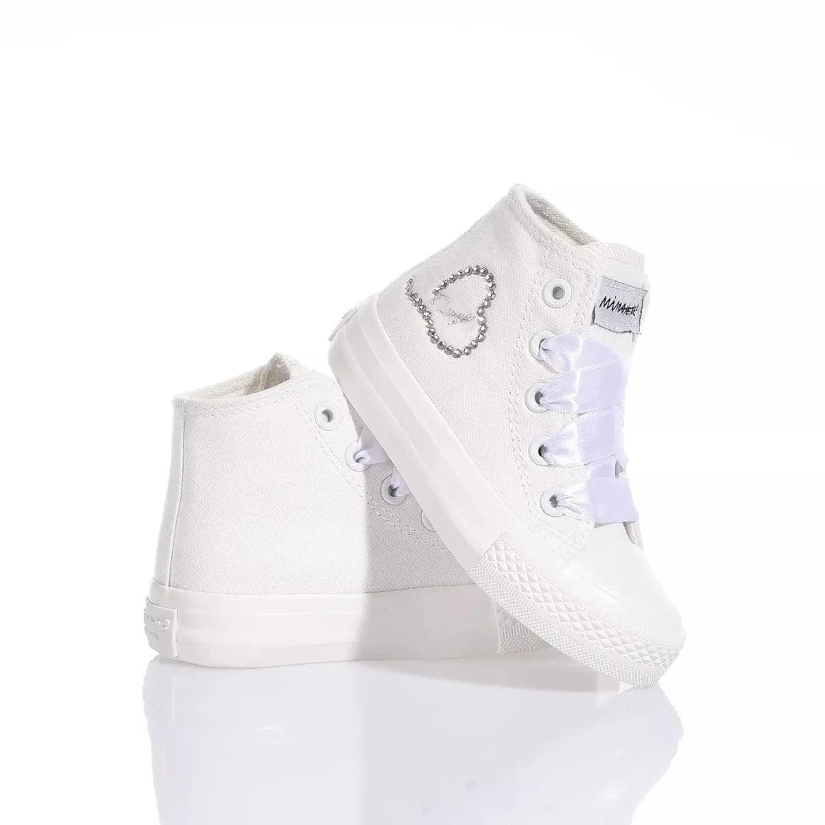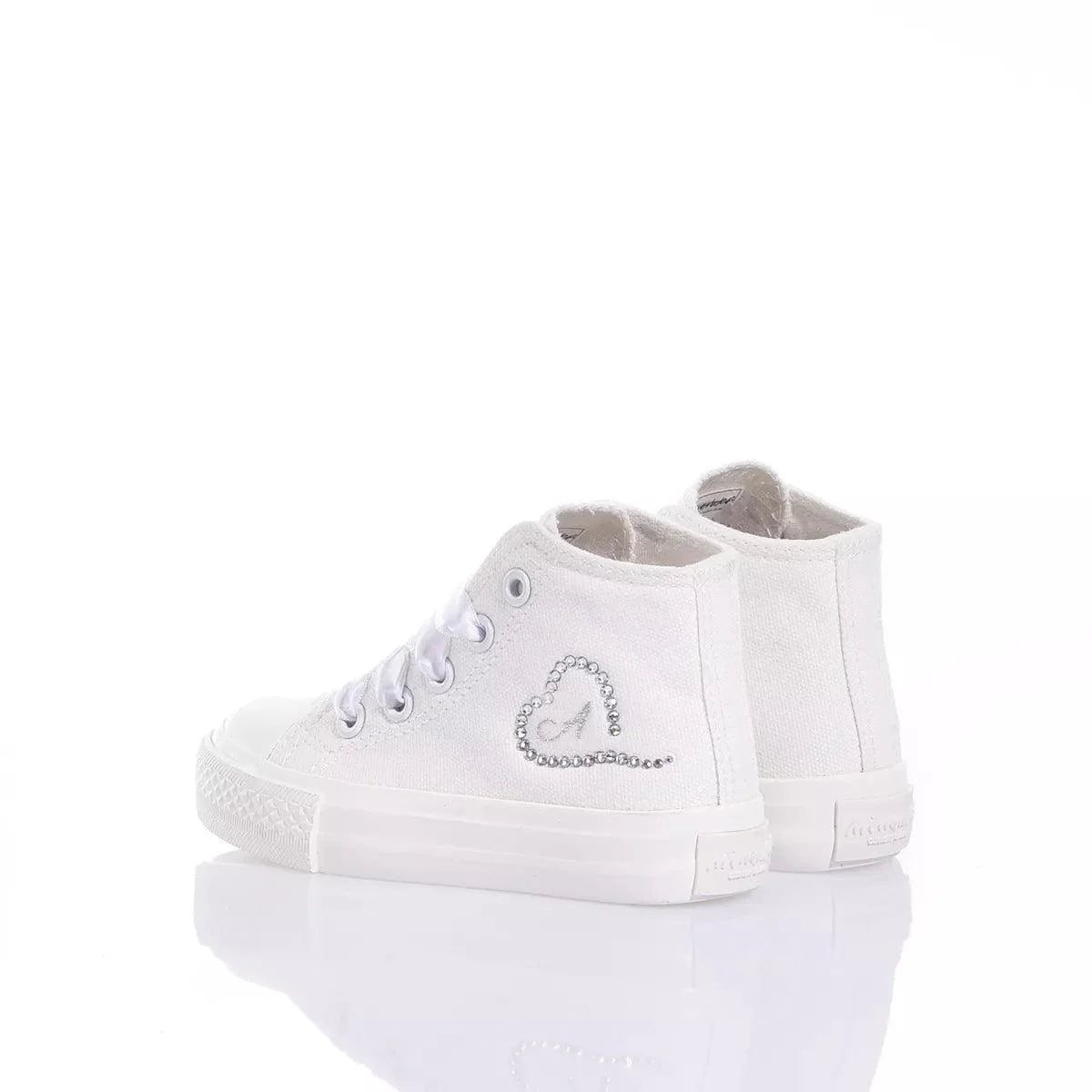 Mimanera Airlines Baby Heart è un piccolo gioiello ispirato al classico modello Converse ma offrendo una suola completamente bianca per renderla ancora più delicata ed elegante. Un cuore di Swarovski fa da cornice all’iniziale del nome della tua bambina in glitter argento, un modo sofisticato di personalizzare la sneakers anche per i più piccoli.