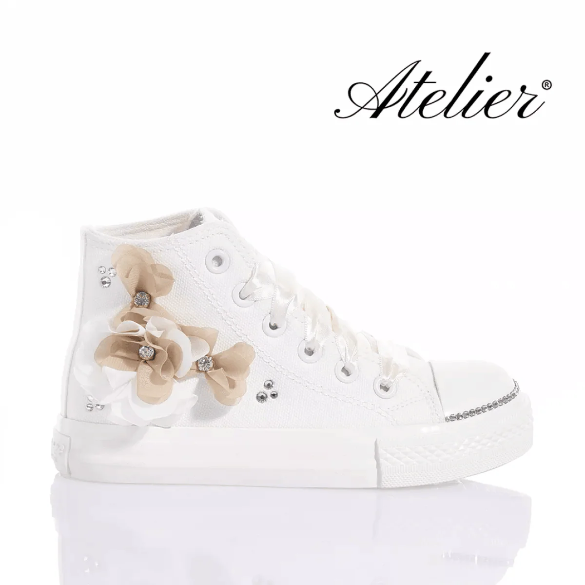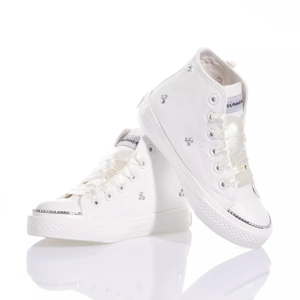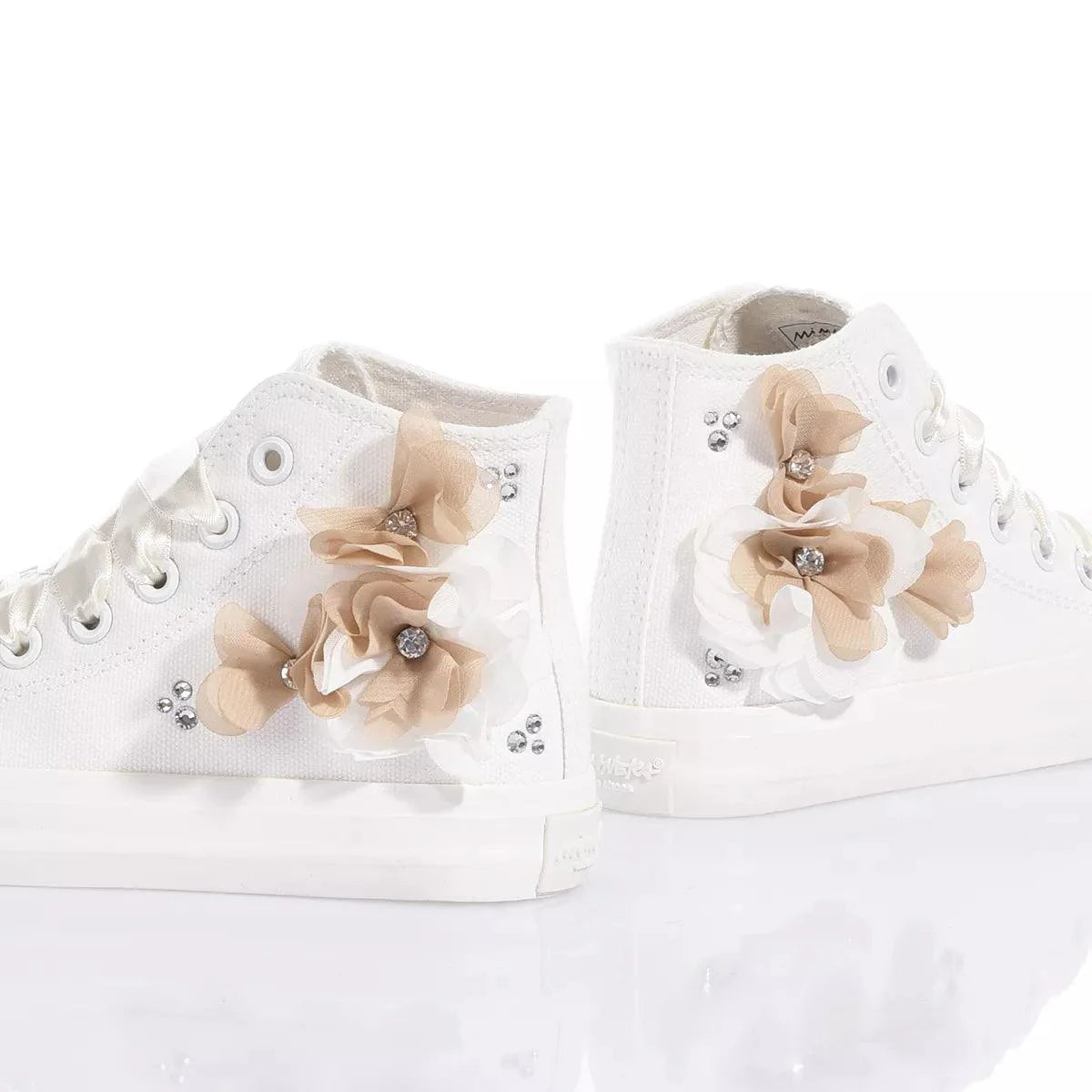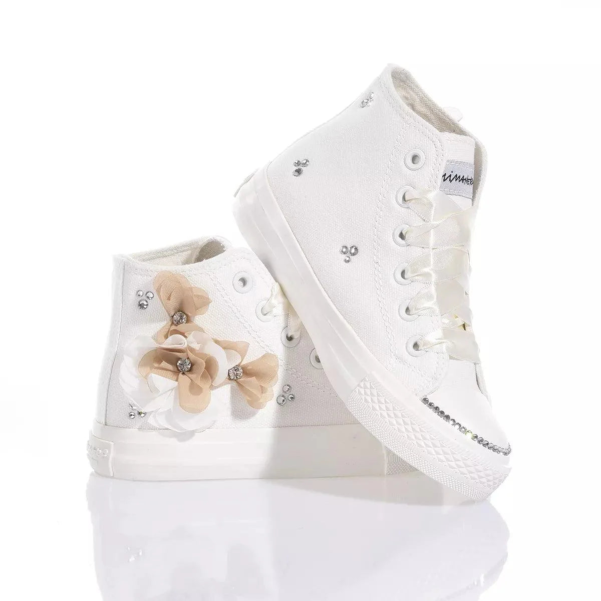 Mimanera Airlines Junior Diana: l'incarnazione dell'eleganza e della comodità. Ispirate al classico modello Converse, queste scarpe offrono una suola completamente bianca. Mimanera Airlines Junior Diana presenta delicate applicazioni di fiori nei toni del bianco e beige, impreziositi da castoni e cristalli Swarovski che aggiungono un tocco di luce e brillantezza abbinata a raffinati lacci in raso panna.