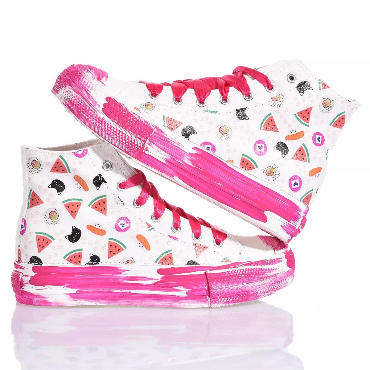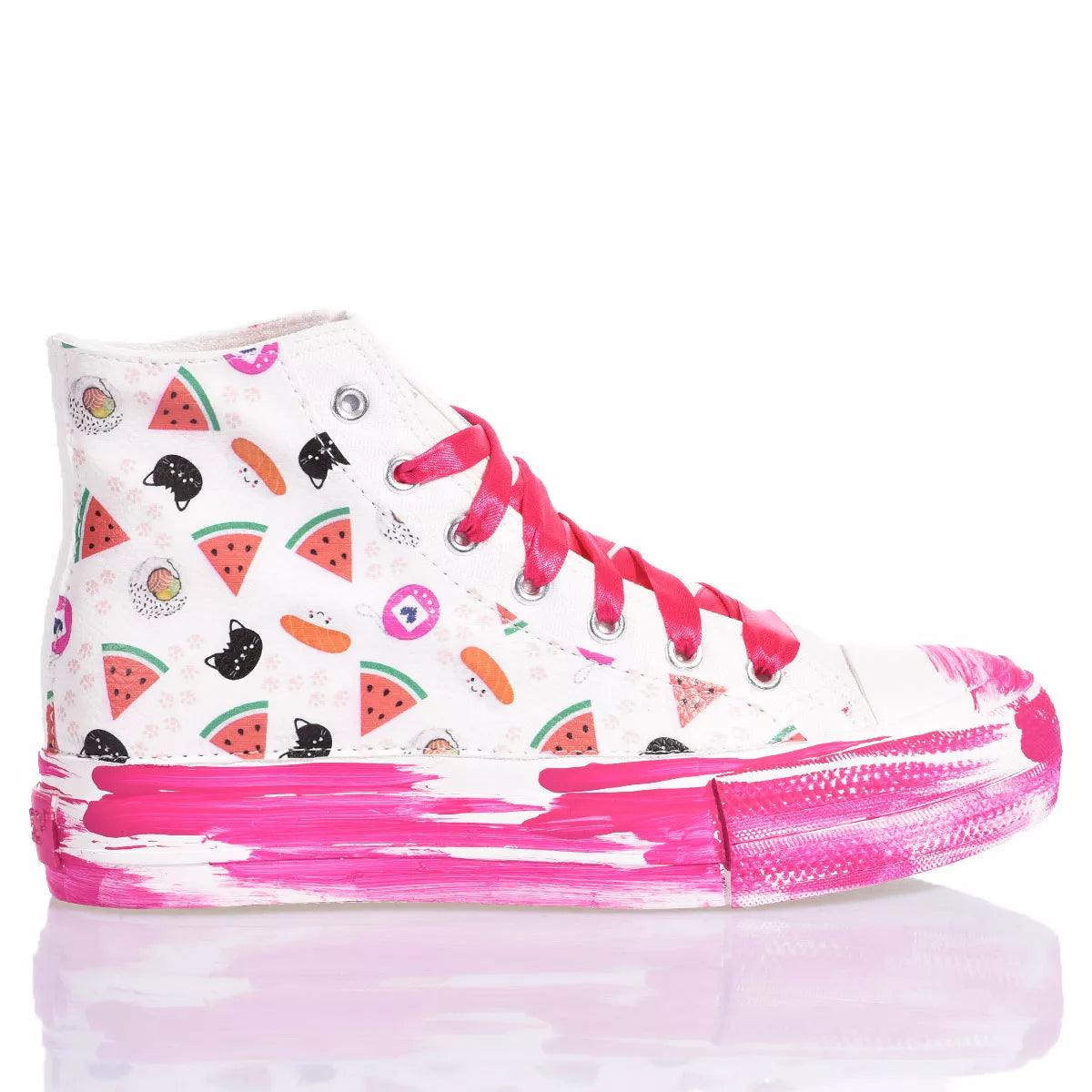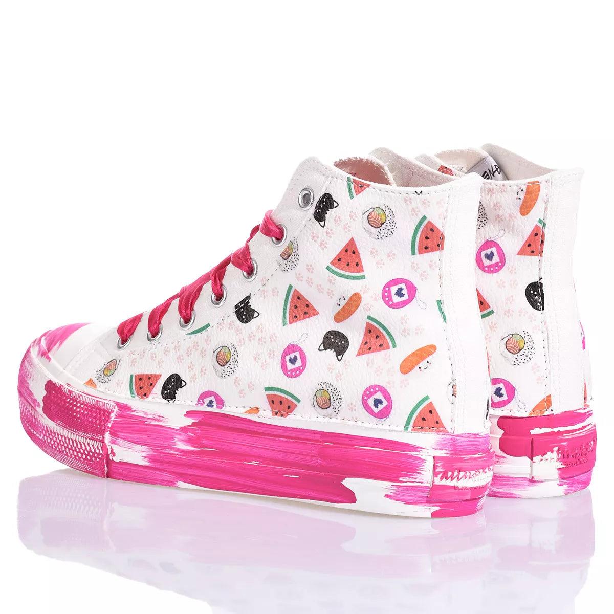 Porta allegria ad ogni tuo passo con le sneakers Mimanera ispirate all’iconico modello Converse in collaborazione con Alyssa di Silvia & Kids. Il design unico e giocoso presenta una fantasia dolce e delicata sui lati e una suola platform con effetto pennellata fuxia, per un tocco vivace e femminile. I lacci in raso fuxia aggiungono un tocco di eleganza e raffinatezza al look. Ma il vero plus di queste sneakers è la possibilità di personalizzazione. E’ infatti possibile aggiungere l'iniziale del tuo nome con il divertente font anguria, rendendo così ogni paio unico e speciale.