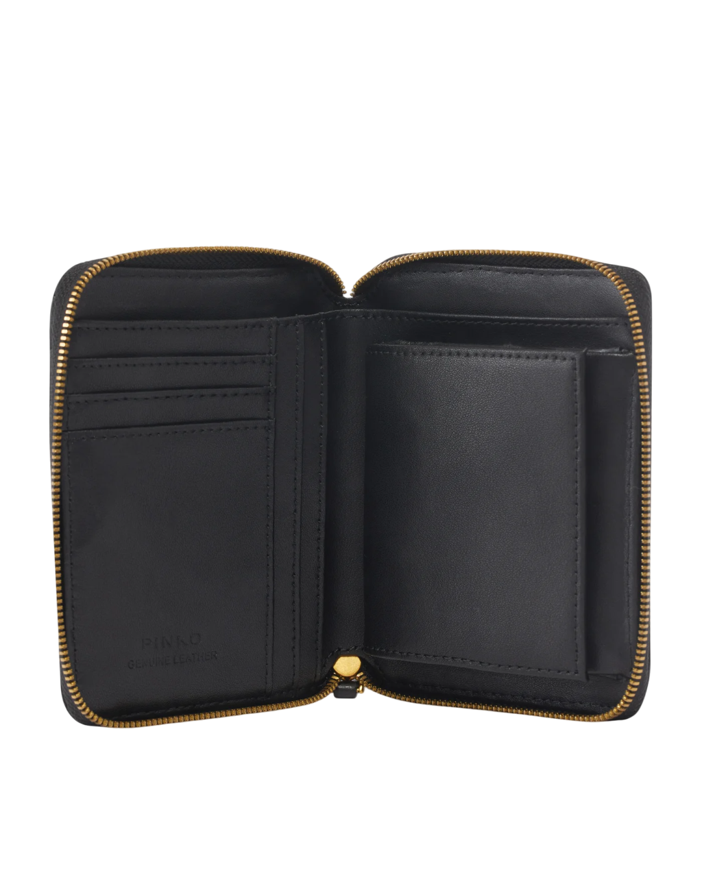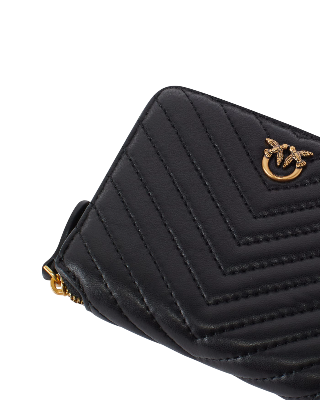 Portafogli da donna realizzato in pelle con trapuntatura chevron. Chiusura con cerniera integrale, placca del logo Love Birds Diamond Cut in metallo dorato sul davanti. L'interno presenta due fessure porta banconote, un taschino porta monete con patta e bottone a pressione, sei fessure porta carte. Misure:-Lunghezza 12 cm-Altezza 10 cm-Profondità 2,5 cm100% pelle