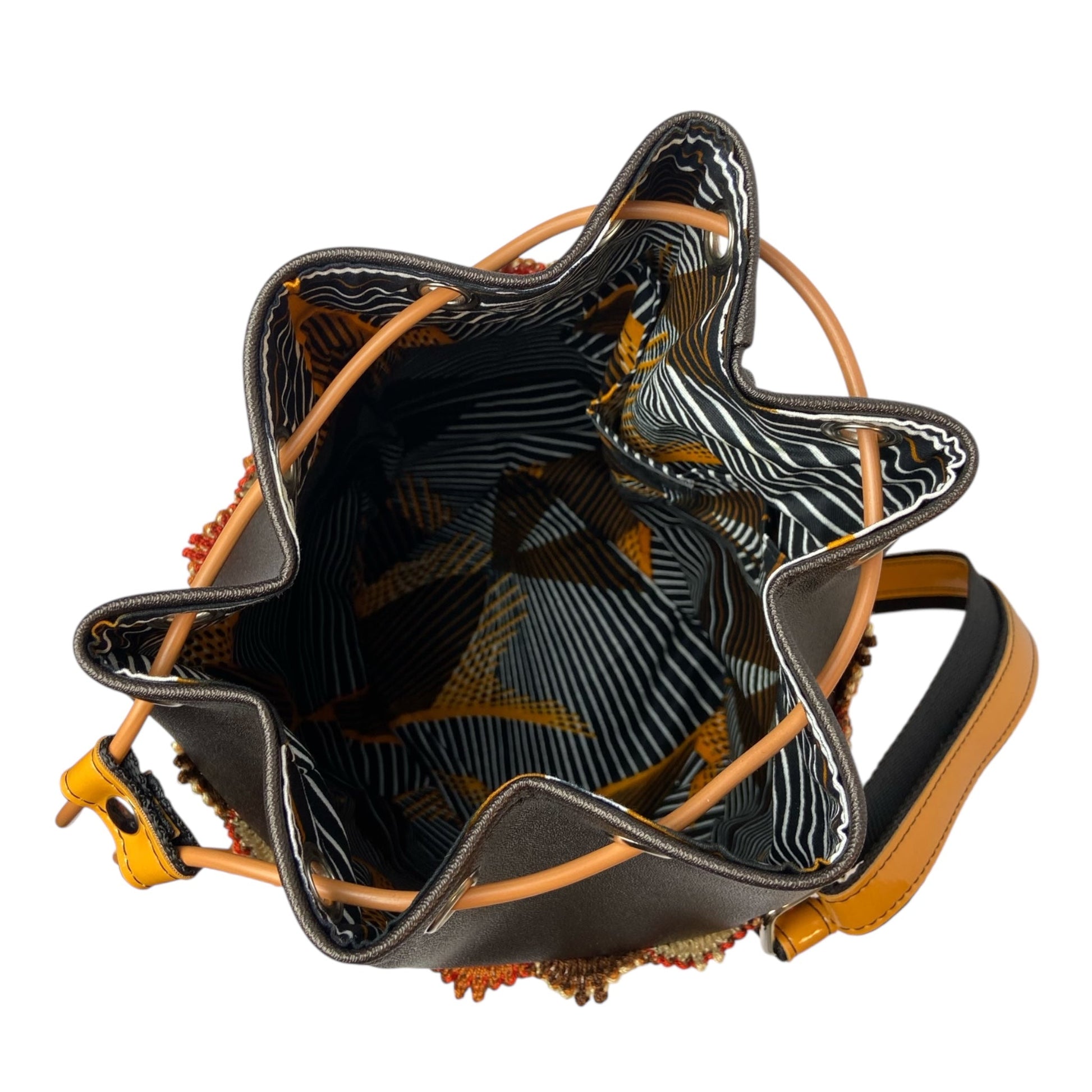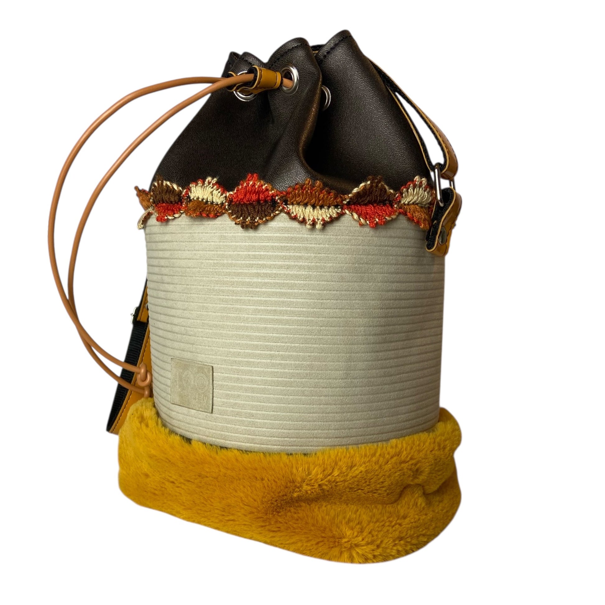 🎨 Dettagli curati: rifinito con passamaneria intrecciata multicolore; bordatura in pelliccia ecologica gialla; interno foderato in cotone wax 100% – fantasia che varia su ogni borsa;