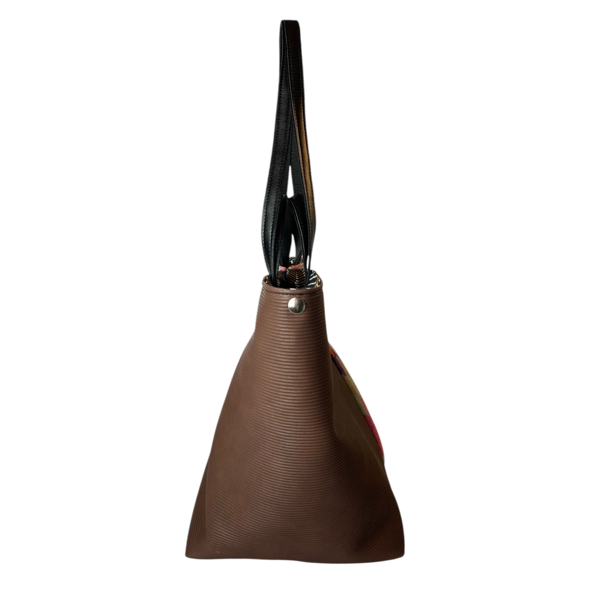 Dotata di quattro manici – due fissi per portarla a mano e due lunghi per indossarla a spalla – questa borsa unisce funzionalità e design.